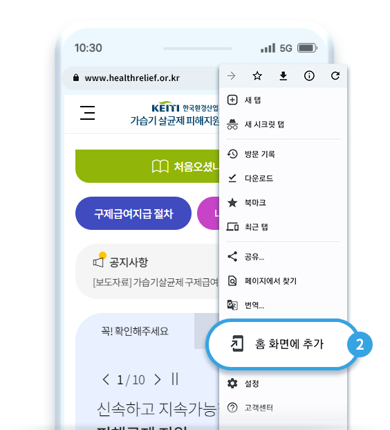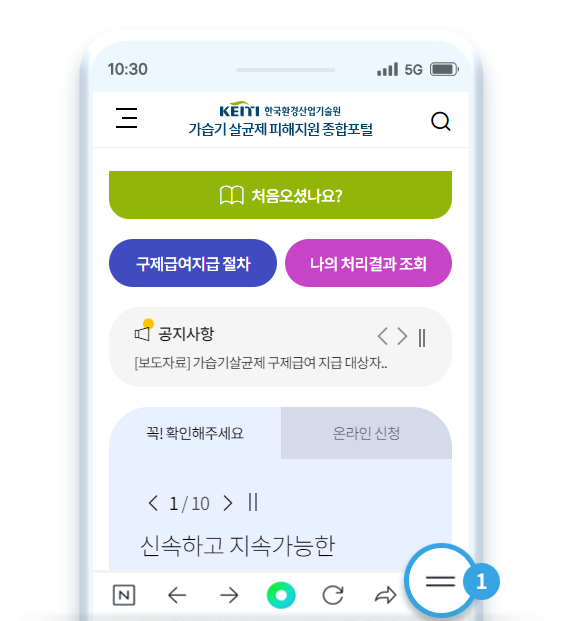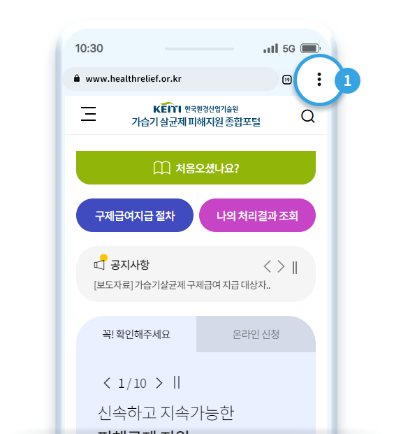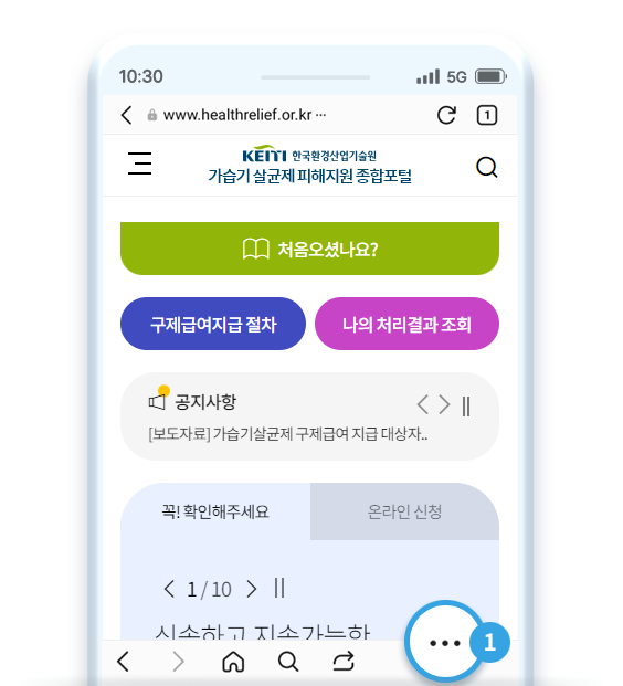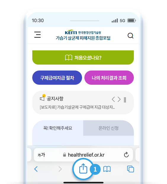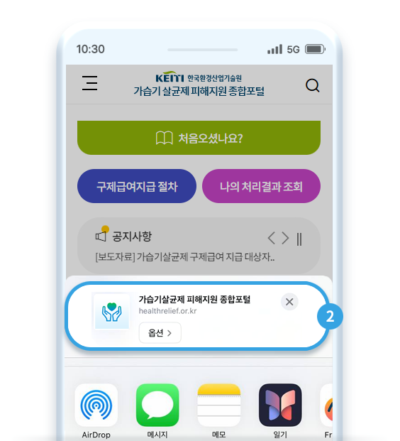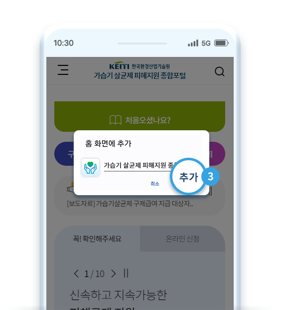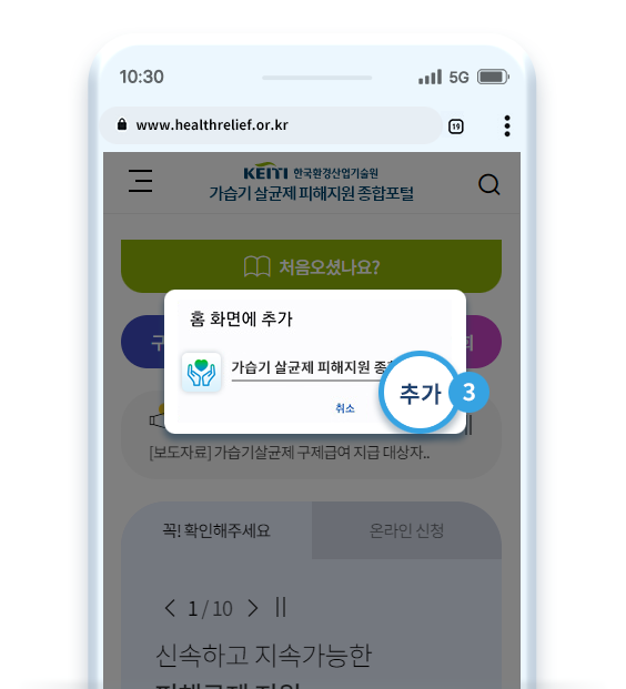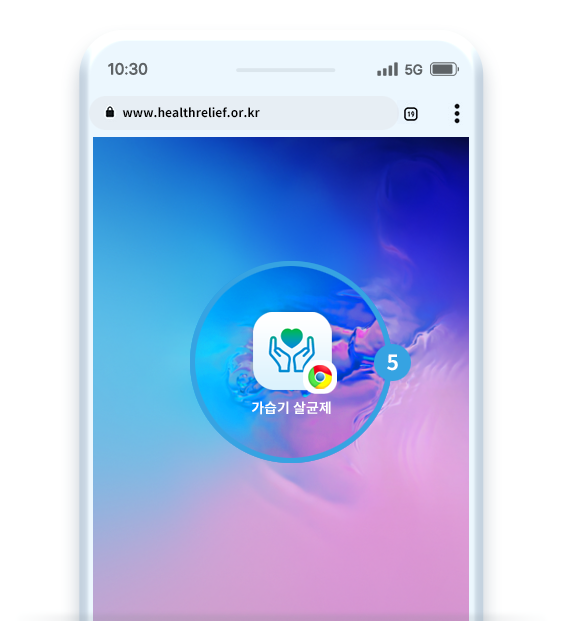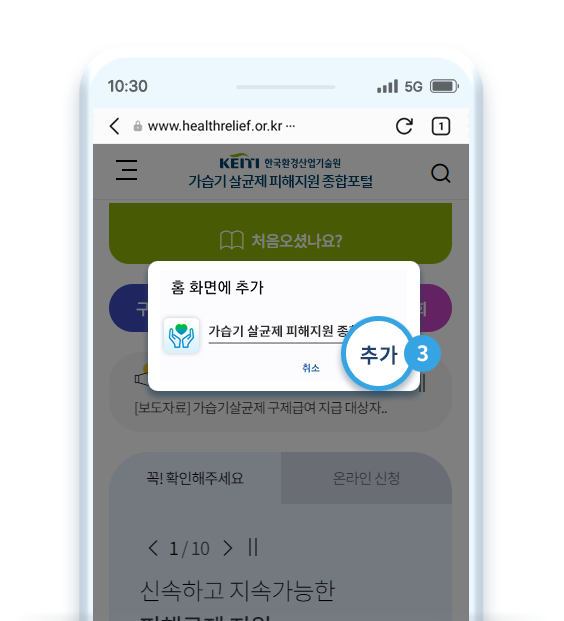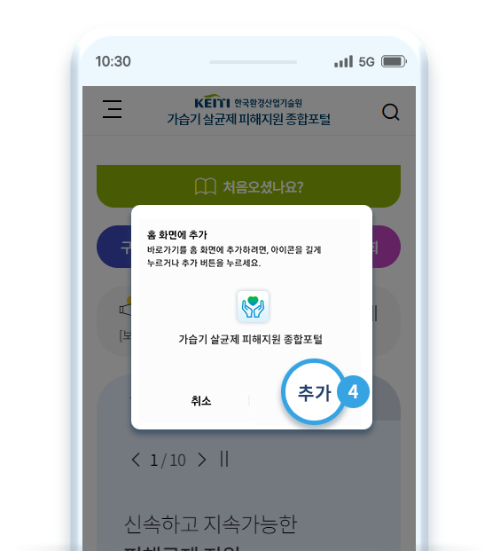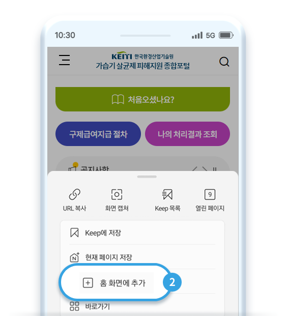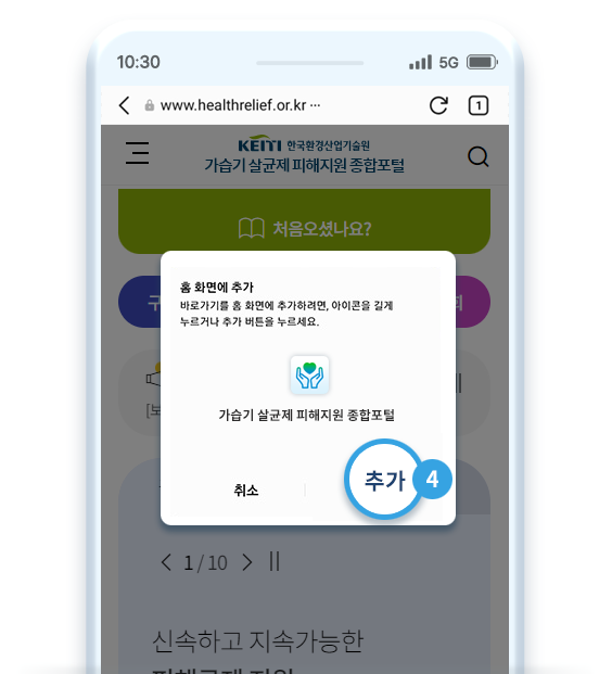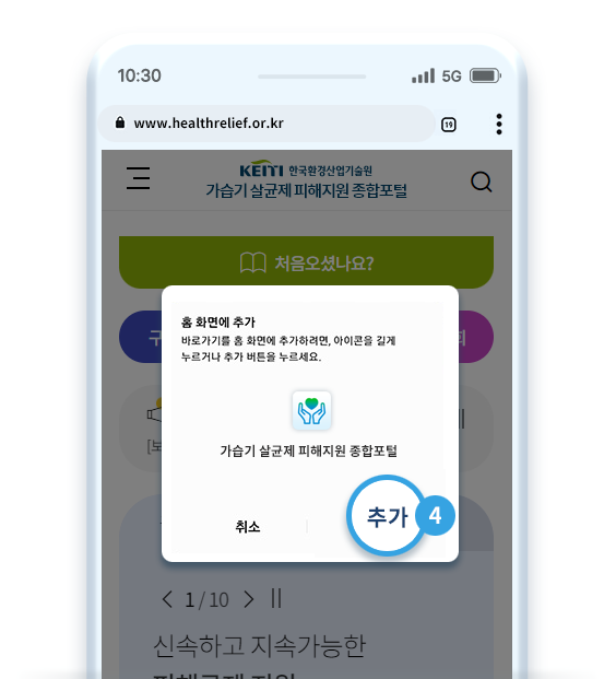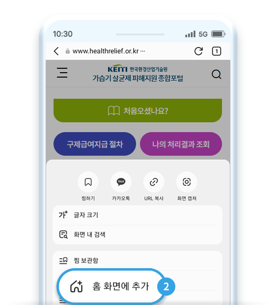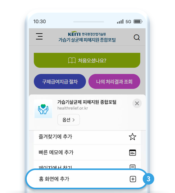5. 휴대폰 바탕화면에서 '가습기살균제 피해지원 종합포털' 페이지로 이동 가능