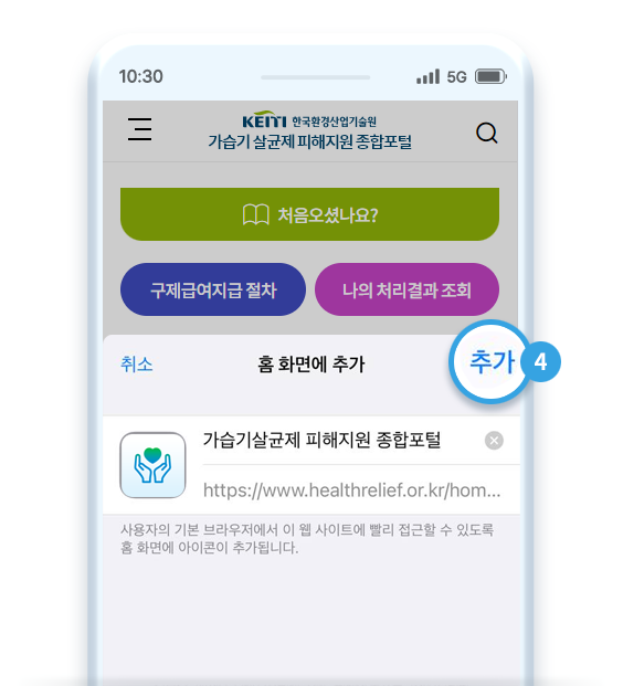 3. '가습기살균제 피해지원 종합포털' 명칭 확인 후 「추가」 (명칭 수정 가능)